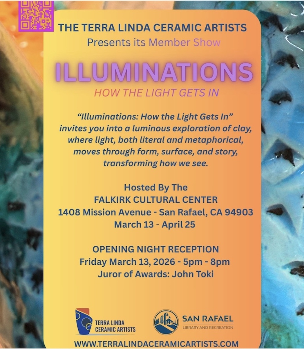 The Terra Linda Ceramic Artists, including ACGA members Geraldine GaNun, Susan Press, Nadia Tarzi Saccardi and Melissa Woodburn present Illuminations:How the Light Gets In with John Toki as Juror of Awards.  This exhibit explores through clay, where light, both literal and metaphorical, moves through form, surface, and story, transforming how we see.  The show is hosted by Falkirk Cultural Center, 1408 Mission Ave., San Rafael 94901 and is open to the public Tues-Fri 1-4:30pm and Sat 10-2pm. Additional information at https://www.terralindaceramicartists.com/news-events